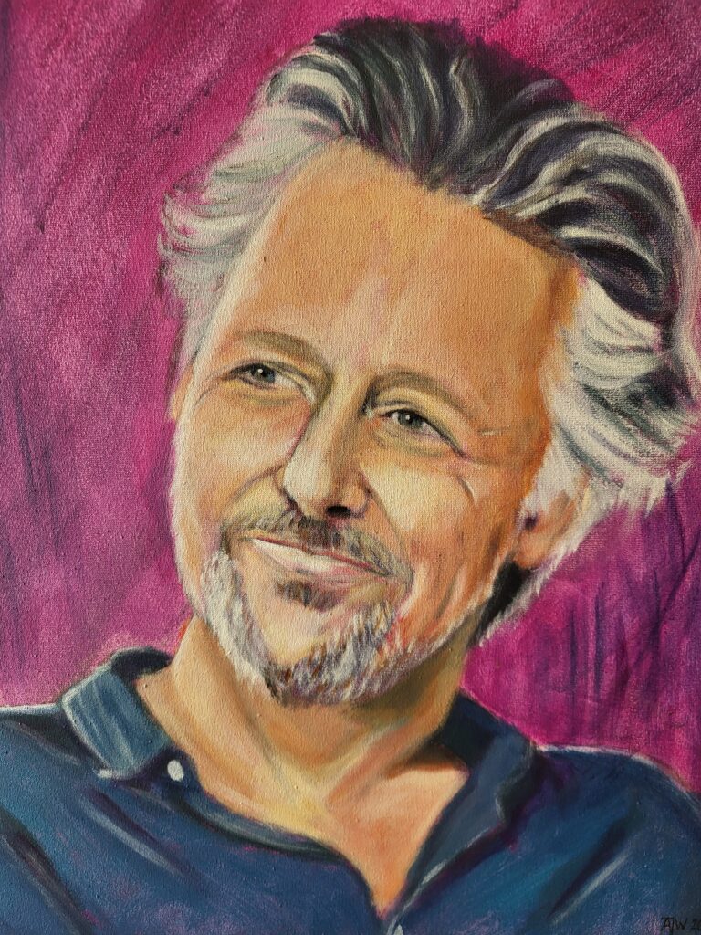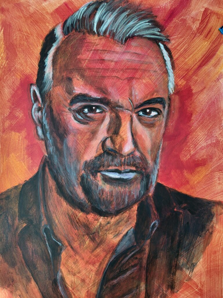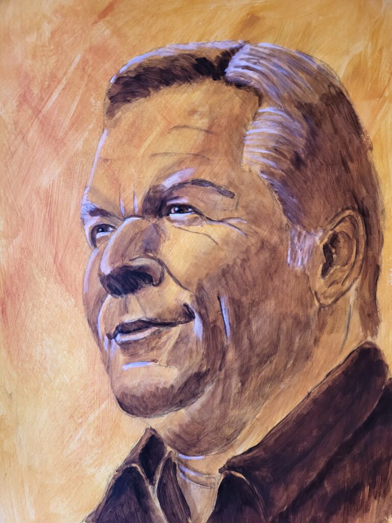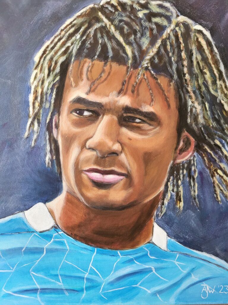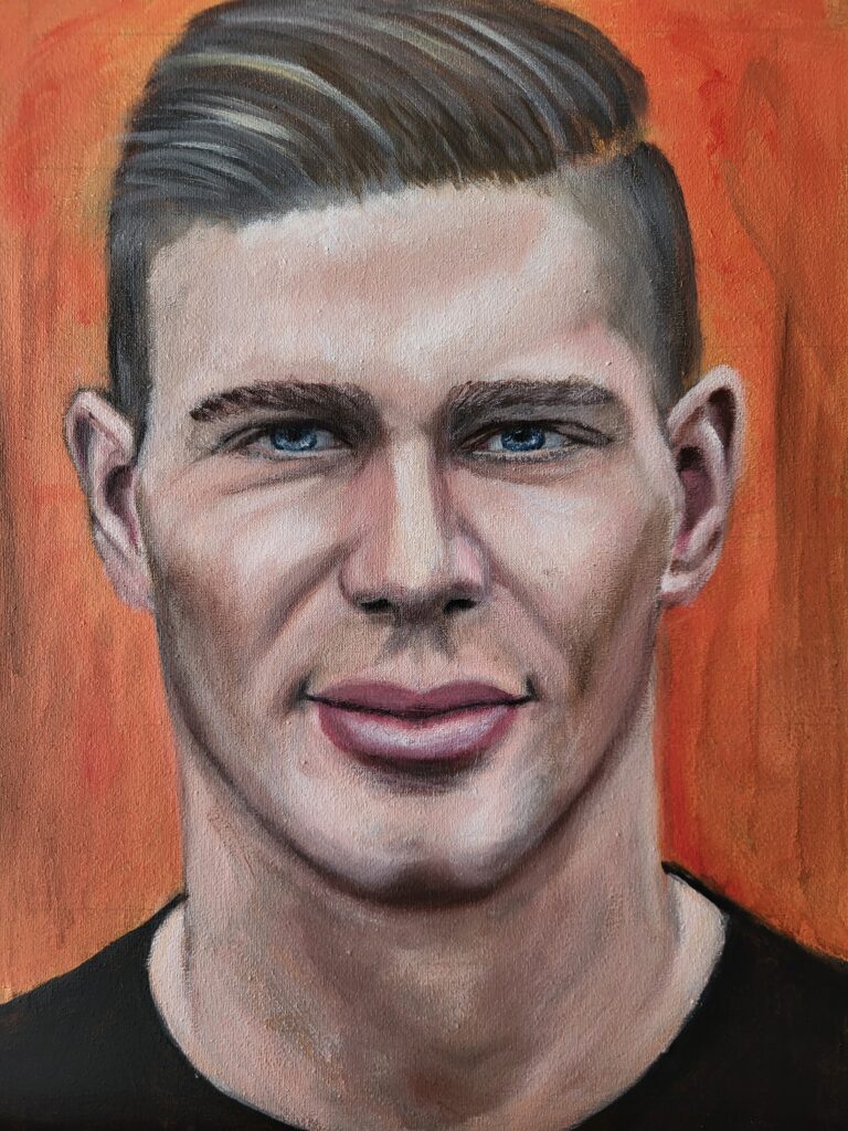 Portrait in blue, white and umber of a great Dutch athlete…in acrylic on paper